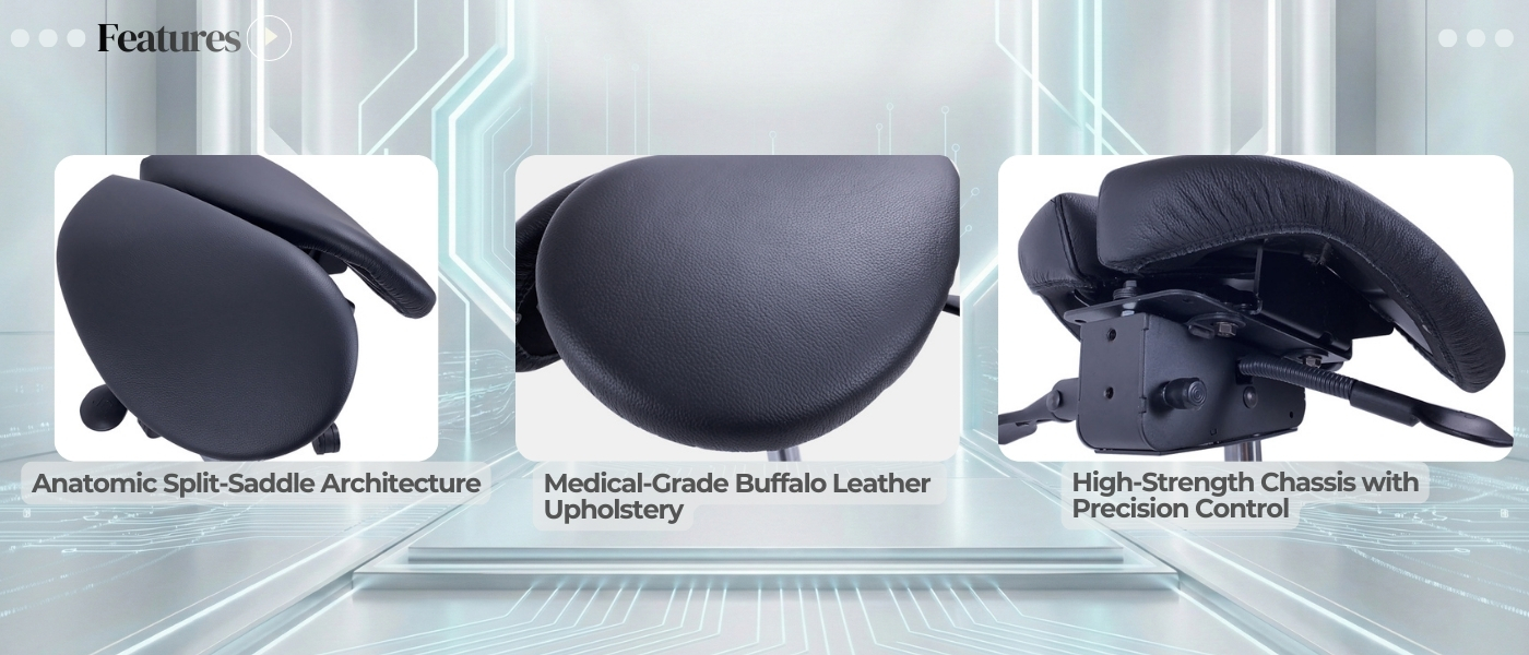 Premium Materials & Application. Wrapped in high-grade black genuine leather, the 903SBL-2F combines excellent texture with durability. It is the ideal solution for professionals who require both compactness and back support—such as dental hygienists, pediatric dentists, and laboratory technicians working in space-restricted environments.