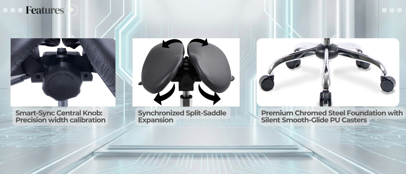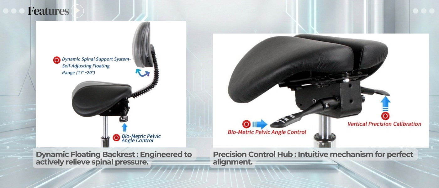 Agile Support for Precision Professionals. The 903SBL-2F combines the agility of our compact saddle series with the endurance of lumbar support. Optimized for smaller body frames and tighter workspaces, this model features a streamlined split-seat design and an Integrated Floating Backrest. It delivers critical spinal stabilization without the bulk, allowing active professionals to maneuver freely while maintaining a fatigue-free posture.