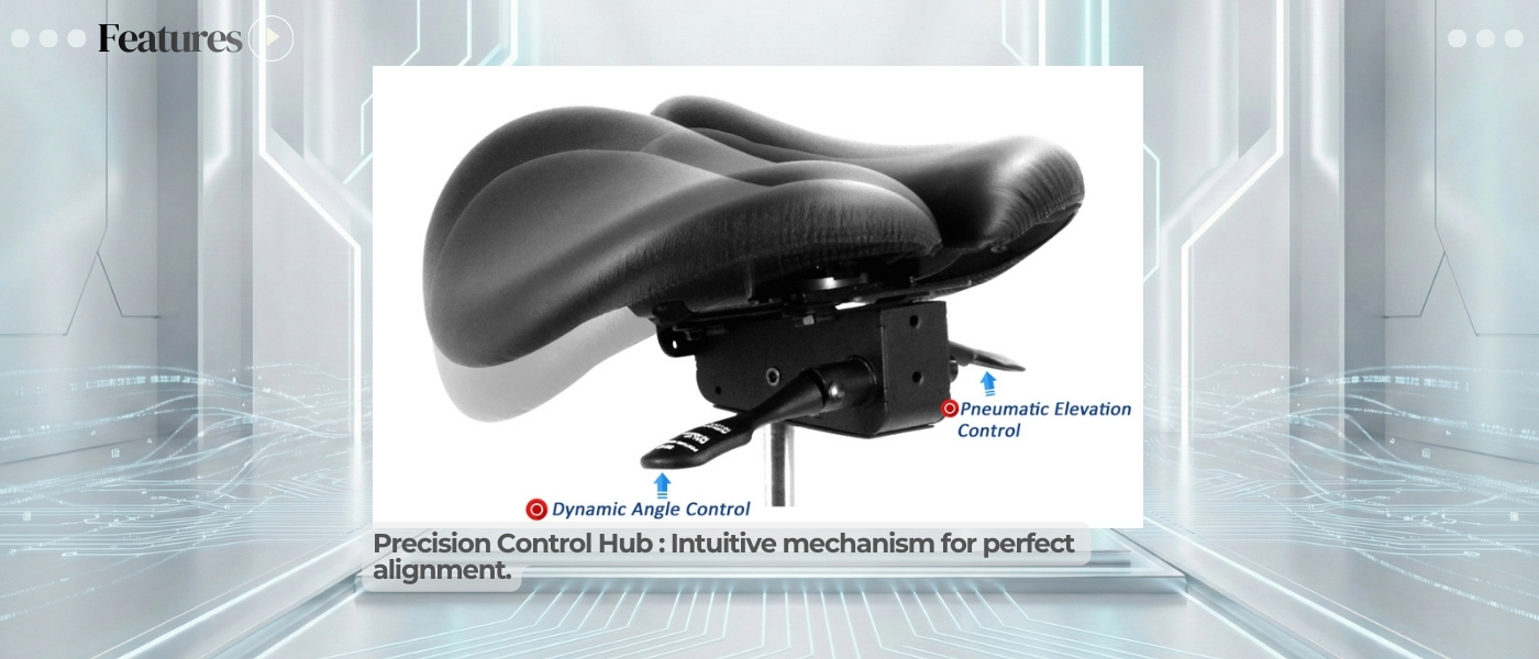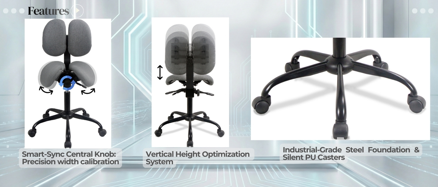 2. Synchronized Calibration : At its center is our Patented Analog Intelligence Node (Central Knob). This mechanism allows for Synchronized Bi-Lateral Calibration, instantly adjusting the R/L cushion width to match your unique bio-metric profile. This ensures a custom-fit interface that stabilizes your posture during high-precision tasks.