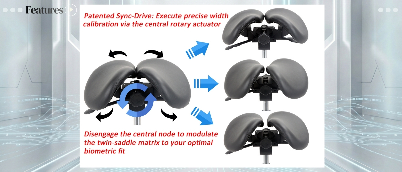 Patented Width Calibration. Achieve a personalized physiological fit with our Patented Central Calibration Knob. This mechanism allows for simultaneous, millimeter-precise width adjustment of the split-saddle cushions, ensuring optimal pelvic support for every user.